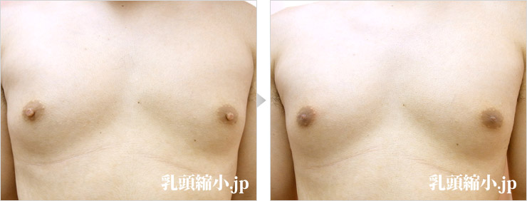 男なのに乳首が大きいというお悩みで御相談いただいた症例です。ジムでトレーニングしている時、Tシャツからプチッと乳首が飛び出して見えるのが恥ずかしくて耐えられないということにより、男性乳頭縮小手術を希望されていました。男性乳頭縮小手術を引き受けてくれるクリニックが少なく苦労されたようです。診察したところ、乳頭の縦幅及び横幅が肥大しており、乳首が飛び出して見えるので、男性乳頭縮小手術の適応と考えられました。乳頭が飛び出さないように、できるだけ平坦に形成しました。手術後は平らで全く目立たない乳首になり、傷もほとんどわからないために喜んでいただきました。クリニックより:男性で乳首が大きいことを気にされて受診される方も少なくありません。そのほとんどが、Tシャツなど薄着になった時、乳首が飛び出して見えるのが気になると言われます。一般的に男性の乳頭は平坦で高さがほとんどないために飛び出さないのですが、乳頭に高さがあると、薄着の時に乳首が飛び出て透けて見えるために恥ずかしいようです。そのような場合、乳頭を埋没させるよう縮小することが必要です。他院で男性乳頭縮小手術を行い、「もう少し小さくしてほしい。」と、希望される患者さんは、乳頭の横幅は小さくなっていますが、高さが変わらないために、Tシャツから依然として乳首が飛び出すという状況の方がほとんどです。このような方は乳頭の高さを変える手術が必要で、テクニックを要します。男性の乳頭縮小は難易度が高いので経験豊富な美容外科医にお願いするのが良いと思います。